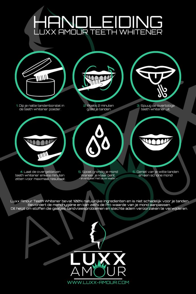 Luxx Amour Teeth Whitener is uiteindelijk gewoon een soort kool dit is pikzwart en kan voor vlekken zorgen bij onjuist gebruik dus let er dat de hoeveelheid die je op je tandenborstel doet niet te veel is en dat het eraf kan vallen en evt op je kledig terecht komen vlekken gaan er dan lastig uit.