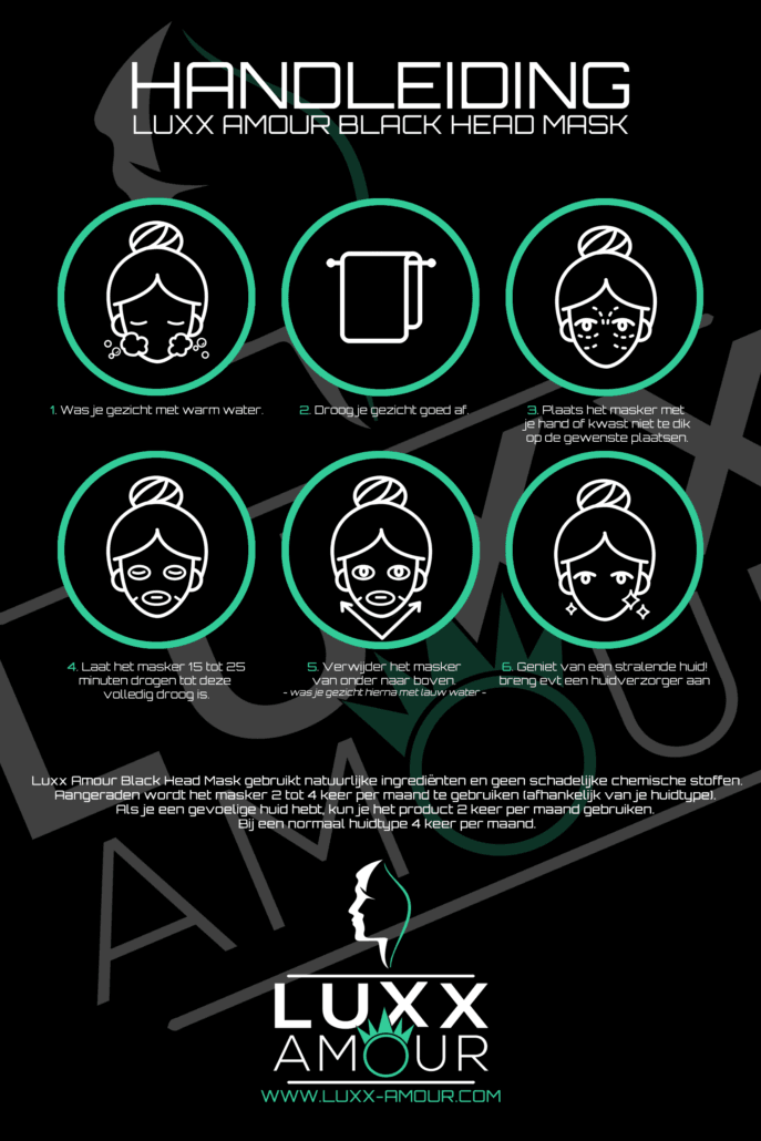 Luxx Amour Black Head Mask bestaat uit water, PVOH, gedenatureerde alcohol, glycerine, bamboo charcoal, ceteth-15, aloe barbadensis blad extract, hamamelis virginiana extract, methyl parahydroxybenzoaat, MIT en parfum